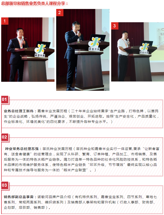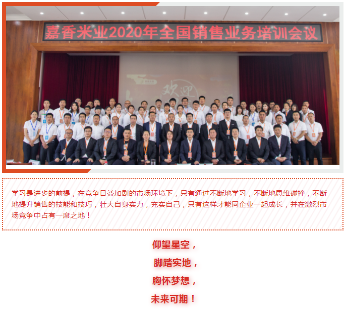 5日,2020年度全國(guó)銷售培訓(xùn)會(huì)議進(jìn)行中,嘉香米業(yè)領(lǐng)導(dǎo)班子、全國(guó)各辦事處領(lǐng)導(dǎo)和銷售骨干共同參加了本次會(huì)議。此次培訓(xùn)由淺入深,涵蓋企業(yè)相關(guān)的各個(gè)方面。從企業(yè)發(fā)展史、企業(yè)文化,到品牌產(chǎn)品的介紹,再到各類型客戶的開發(fā)等,展開了深入而又全面的探討學(xué)習(xí)。讓銷售人員接受到了系統(tǒng)、專業(yè)、全面的培訓(xùn)。
